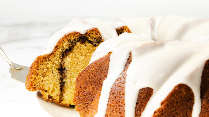 A glazed bundt cake with a golden interior sits on a glass cake stand. A gold knife is partially inserted, lifting two thick slices from the cake.A glazed bundt cake with a golden interior sits on a glass cake stand. A gold knife is partially inserted, lifting two thick slices from the cake.Image Credit: Erren Hart/Erren’s Kitchen