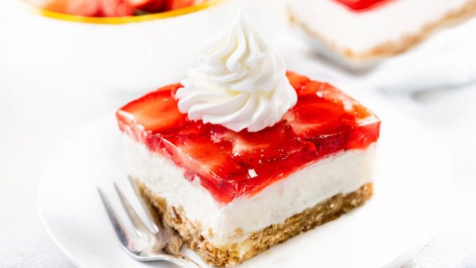 A slice of Strawberry Pretzel Salad with a graham cracker crust, creamy filling, strawberry topping, and a swirl of whipped cream on top—classic comfort inspired by Southern recipes—served on a white plate with a fork.A slice of Strawberry Pretzel Salad with a graham cracker crust, creamy filling, strawberry topping, and a swirl of whipped cream on top—classic comfort inspired by Southern recipes—served on a white plate with a fork.Image Credit: Erren Hart/Erren’s Kitchen