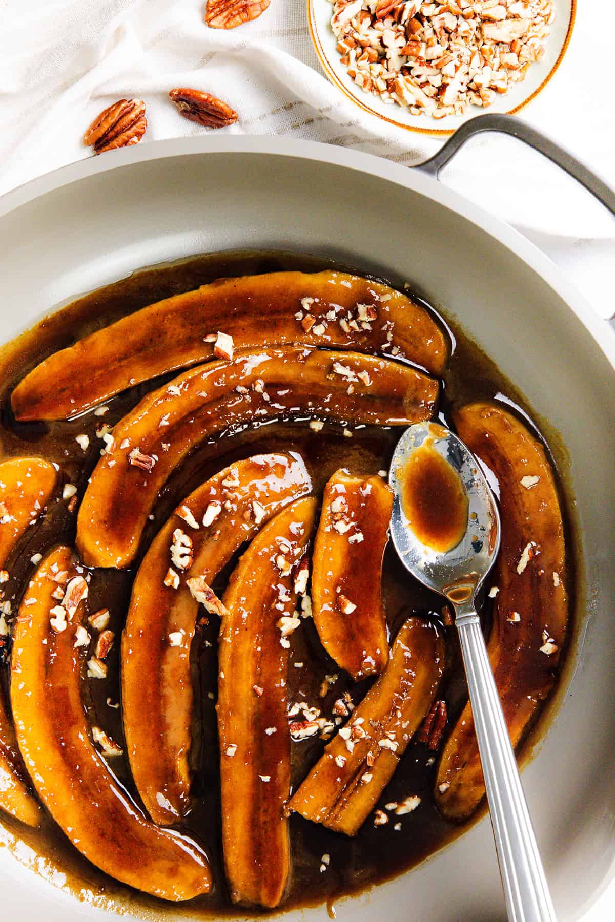 And that’s it! Scoop some vanilla ice cream into a bowl, spoon those caramelized bananas right on top, drizzle over all that extra sauce, and finish with a handful of chopped pecans.