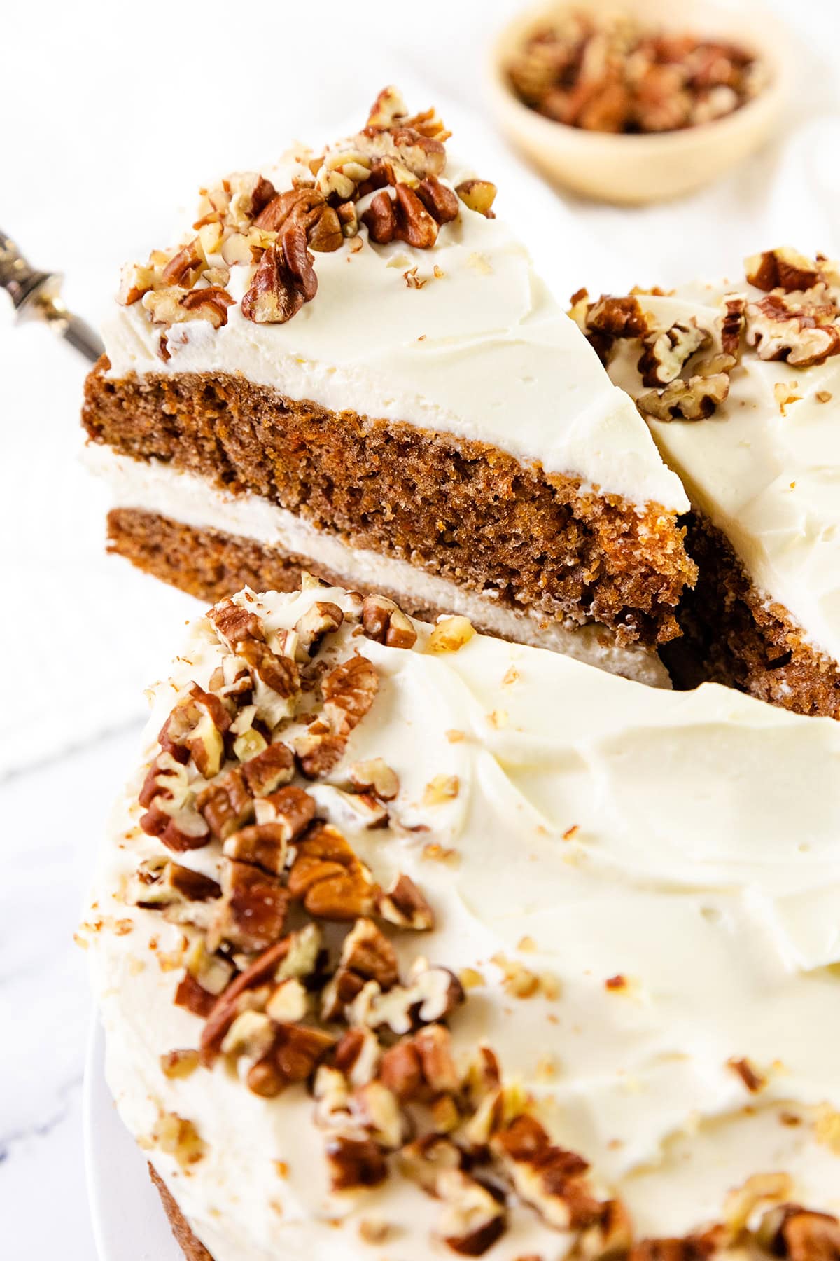 Store your carrot cake, covered tightly, in the refrigerator for up to 5 days. Let it sit out at room temperature for about 20 minutes before serving for the best taste and texture.
