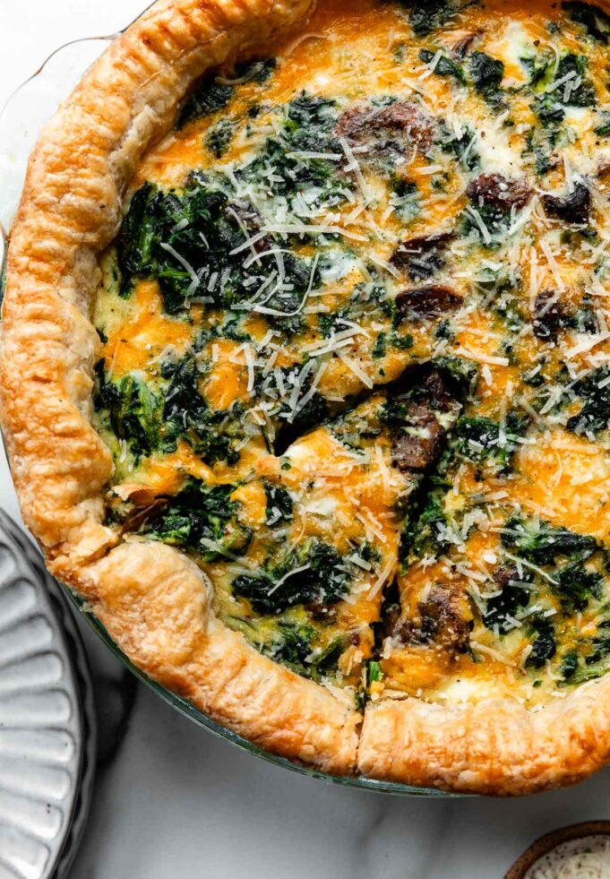 Menggunakan resep quiche favorit saya sebagai titik awal, quiche bayam keju ini adalah pilihan yang gurih, lembut, dan memuaskan untuk makan siang, makan siang, atau makan malam. Betapapun gurihnya isian puding telur, rasanya LEBIH BAIK dipadukan dengan kulit pai serpihan mentega saya! Yang ini selalu menyenangkan banyak orang.