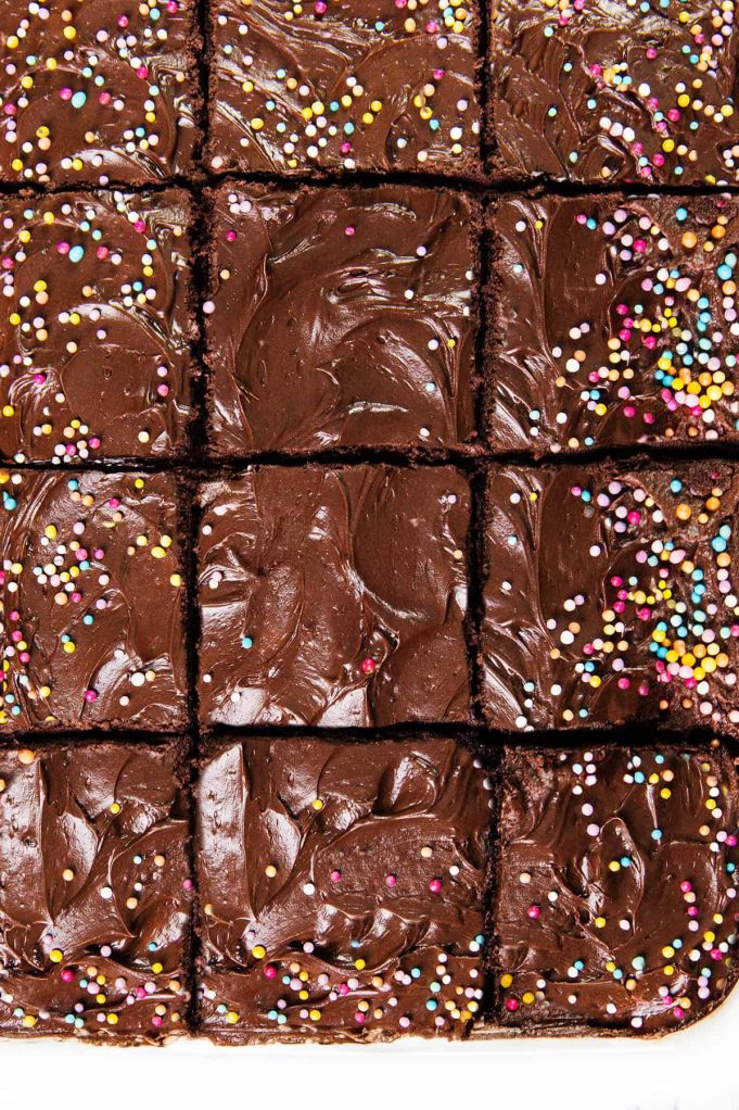 Moist chocolate sheet cake with whipped ganache frosting! Rich, decadent, and easy to make. Perfect for any occasion.