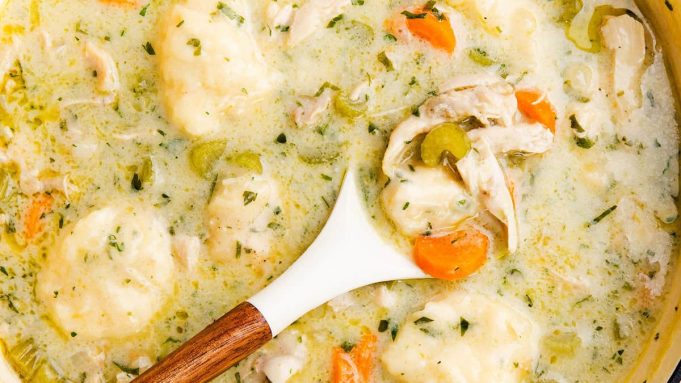 Sup krim ayam dan pangsit dengan potongan ayam, wortel, seledri, dan bumbu terlihat. Sendok bergagang kayu menyendok sebagian sup kental, menonjolkan pangsit empuk dan sayuran segar.Sup krim ayam dan pangsit dengan potongan ayam, wortel, seledri, dan bumbu terlihat. Sendok bergagang kayu menyendok sebagian sup kental, menonjolkan pangsit empuk dan sayuran segar.Kredit Gambar: Dapur Erren Hart/Erren