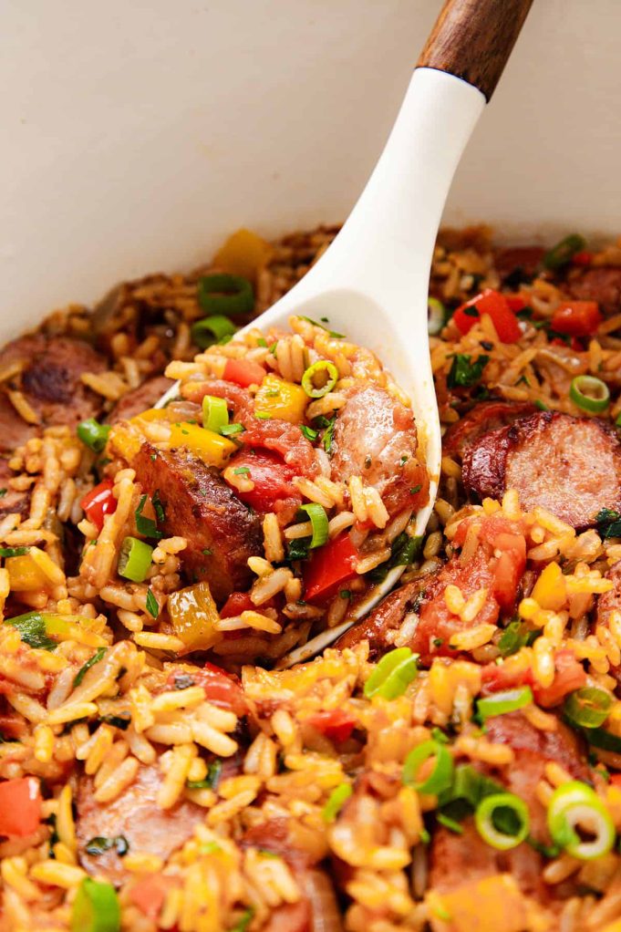 A One Pot Sausage and Rice brimming with sliced sausage, rice, and diced bell peppers in a rich tomato-based sauce. A white spoon scoops the savory mixture while green onions are sprinkled on top for garnish.A One Pot Sausage and Rice brimming with sliced sausage, rice, and diced bell peppers in a rich tomato-based sauce. A white spoon scoops the savory mixture while green onions are sprinkled on top for garnish.