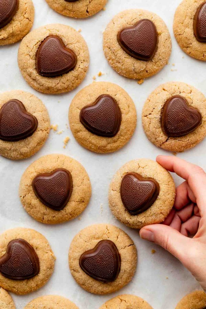 With a chocolate heart candy nestled on top, these super soft sweetheart peanut butter Valentine’s Day cookies are the February version of peanut butter blossoms!