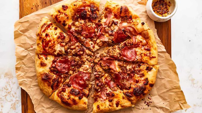 A delicious pizza with a crispy golden crust is topped with generous amounts of cheese, pepperoni, ham, and crumbled sausage. The pizza is sliced into eight pieces and placed on a sheet of parchment paper. Inspired by Asian recipes, a small bowl of chili flakes sits beside the pizza.