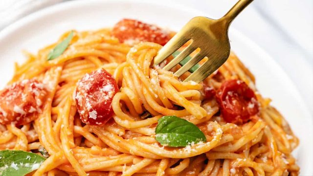 Piring putih dengan porsi spageti dengan saus tomat dan daun kemangi.Piring putih dengan porsi spageti dengan saus tomat dan daun kemangi.Kredit Foto: Dapur Erren