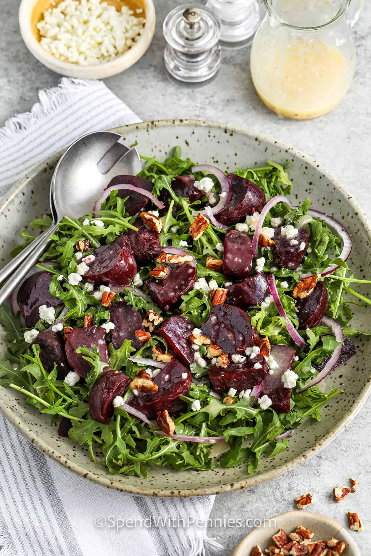 Resep salad bit ini memiliki bit panggang dan arugula pedas dengan saus buatan sendiri yang mudah. Sajikan sebagai sisi atau makanan ringan