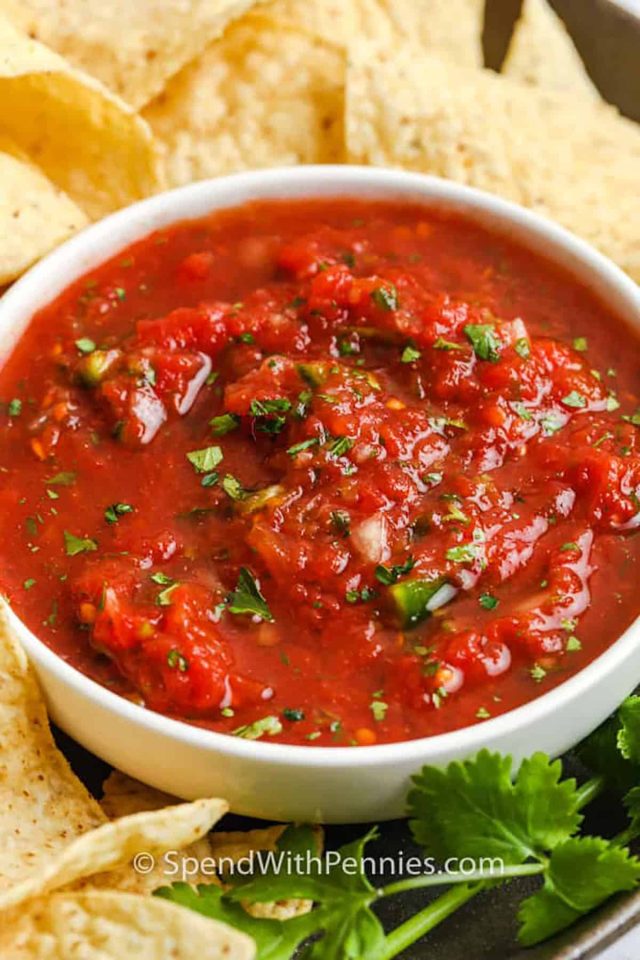 Salsa buatan sendiri adalah saus cepat dan beraroma yang dibuat dengan tomat kalengan, rempah segar, dan jeruk nipis.